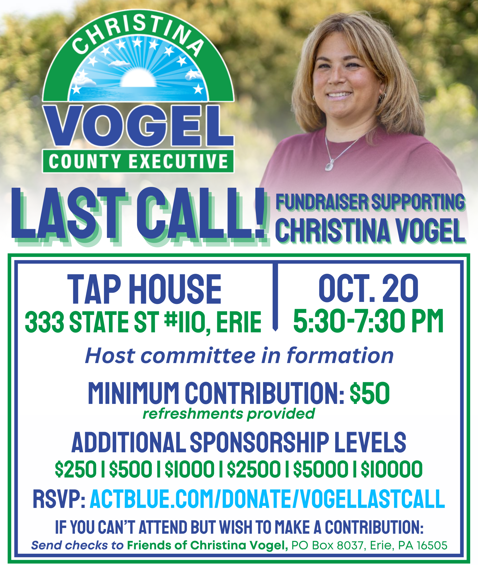 Last Call! Fundraiser for Christina Vogel Monday, October 20, 2025 5:30 PM 7:30 PM U Pick 6 Tap House 333 State St #110 Erie, PA USA (map) Google Calendar ICS